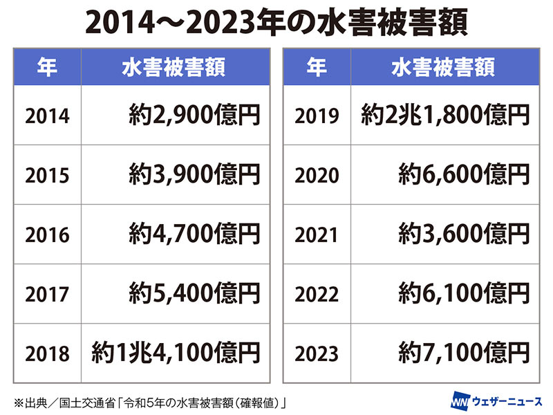 国土交通省が今年7月に公表した「水害被害額(確報値)」によると、2014~2023年の10年間の被害総額は約7兆6200億円。2019年が約2兆1800億円と最も多く、2018年の約1兆4100億円が続きます。2023年も約7100億円の被害が生じました。