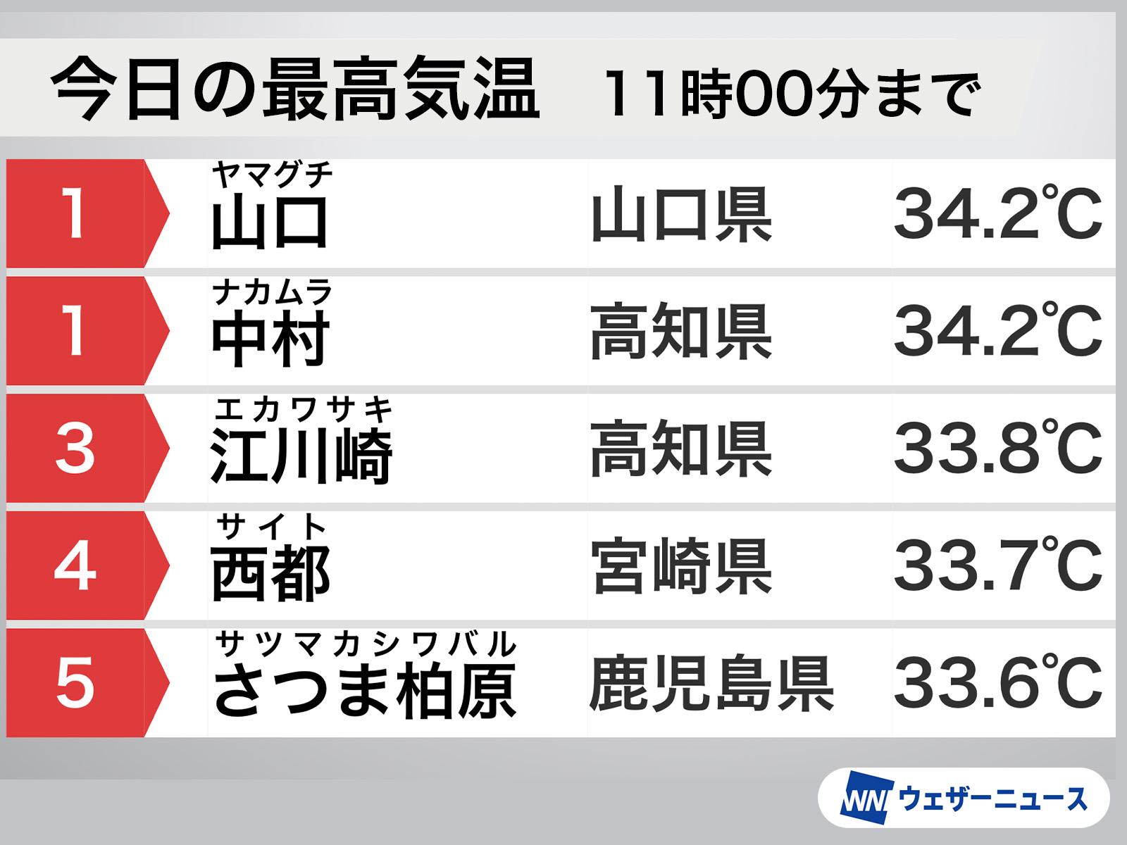 11時までに全国で最も気温が高くなったのは、山口市と高知県四万十市中村で34.2℃でした。午前中は西日本で特に気温が高くなっています。