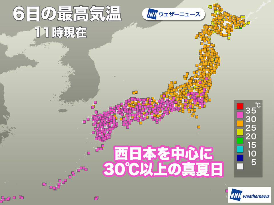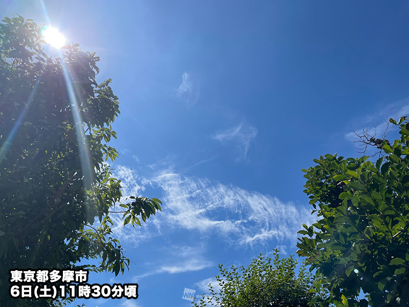 今日6日(土)11時までに、福岡で33.2℃、大阪で31.7℃、名古屋で32.1℃、東京で31.5℃まで気温が上がりました。晴れて強い日差しが届くことで気温が上昇し、午前中から各地で30℃を上回っています。