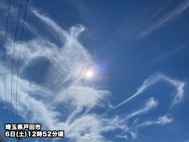 この雲は「巻雲(けんうん)」と呼ばれる、上空高いところに出る薄雲です。
