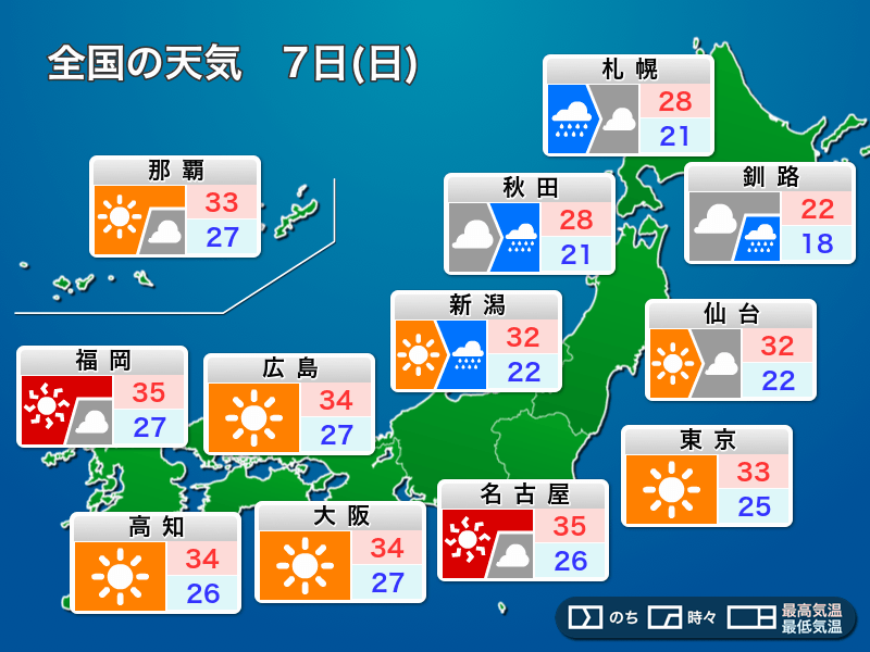天気が崩れる北海道や東北北部は30℃に届かない所が多いものの、昼間はムシムシと感じられそうです。