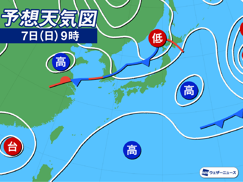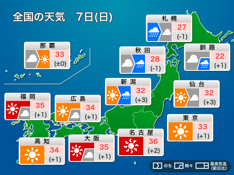 西日本や東日本は太平洋側を中心に高気圧に覆われます。青空が広がり、最高気温は35℃くらいまで上がる所が多い予想です。