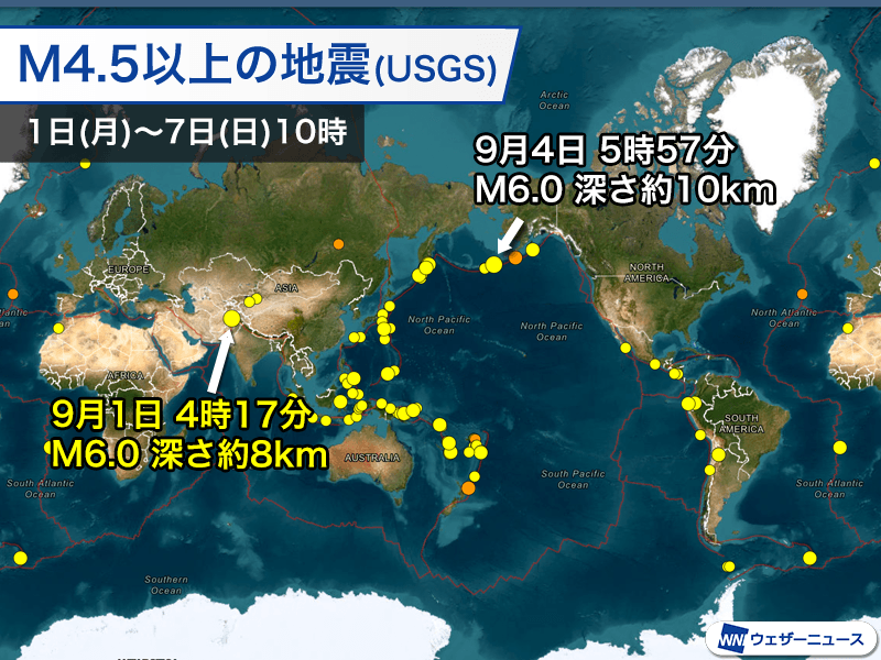 アメリカ地質調査所の解析によるマグニチュード6以上の地震は2回発生しています。最も大きな地震は、アフガニスタンとアラスカ半島の沖で発生したマグニチュード6.0です。