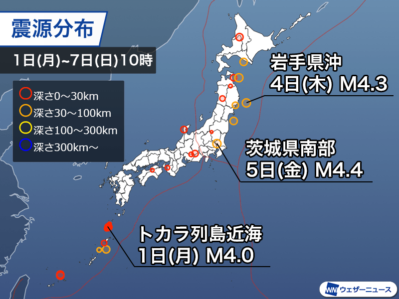 国内:トカラ列島近海で最大震度4