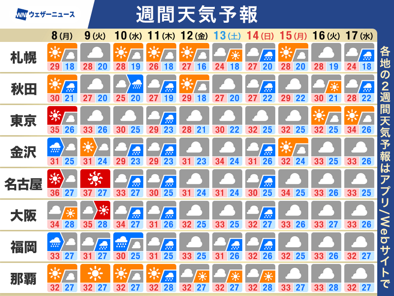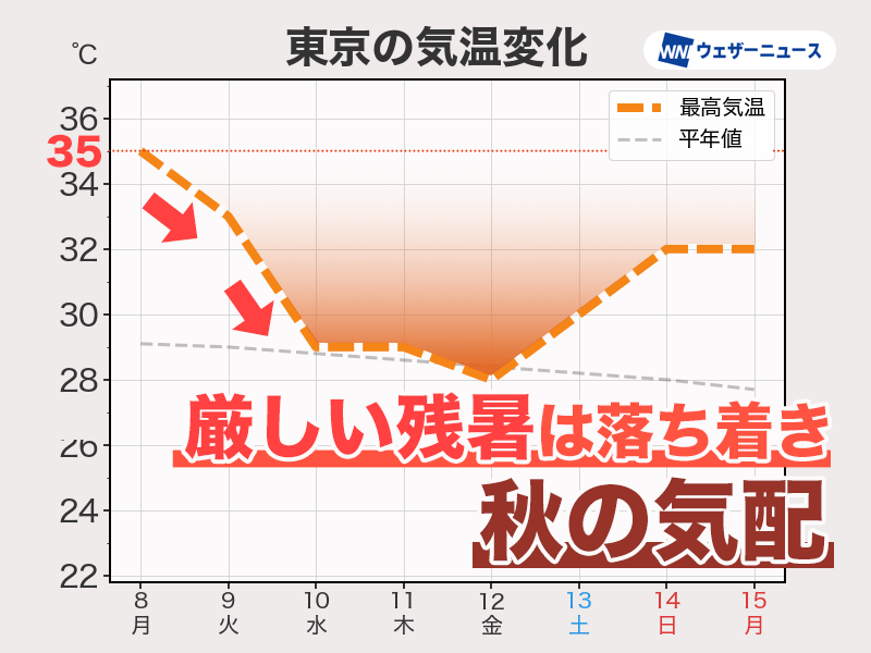 週明けは日差しの届くところで最高気温が35℃以上の猛暑日となるなど、厳しい残暑が続く見込みですが、週中頃以降は曇りや雨の日が多くなり、猛烈な暑さは次第に落ち着くとみられます。