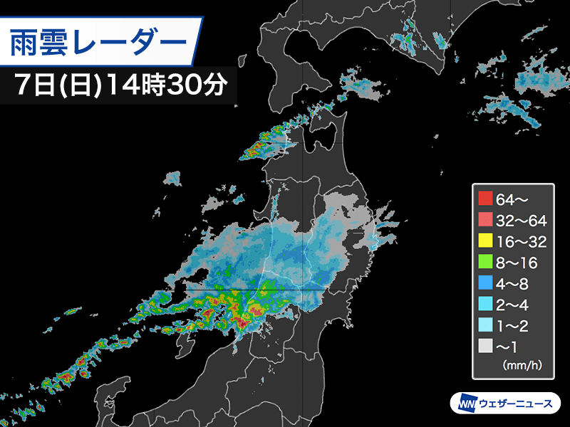 今日7日(日)午前中に青森県や秋田県で雨を降らせた前線の雨雲がゆっくりと南下。午後は山形県や新潟県下越を中心に強い雨を降らせています。
