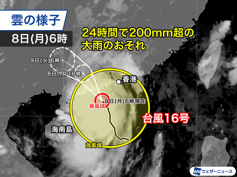 台風16号は南シナ海を北北西に進んでいます。台風を取り巻く雲の一部は香港などにかかってきました。今後も北上を続けて今日の昼頃には中国・華南に上陸する見込みです。