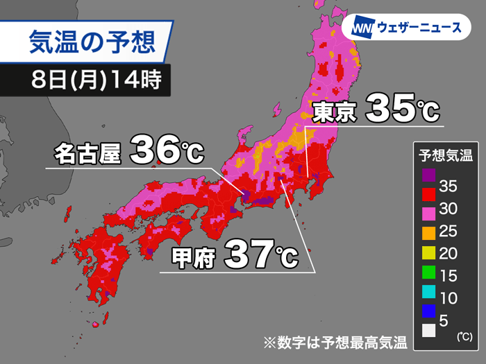 各地の予想最高気温は山梨県甲府市では37℃と体温並みの厳しい残暑となるとみています。名古屋市では36℃、東京都心や高松市などでも35℃まで上がり、猛暑日になる予想です。
