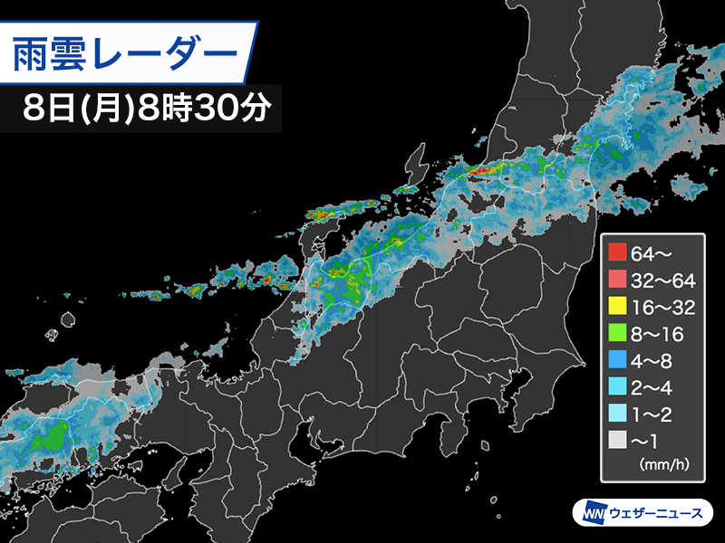 前線に向かって流れ込む暖かく湿った空気の影響で発達した雨雲が流れ込み、局地的に激しい雨となっています。