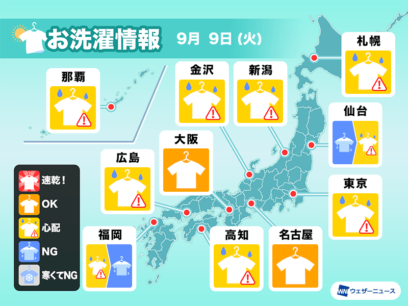 東海や近畿では強い日差しが照りつけて外干しができそうですが、夜はにわか雨が降る可能性があります。ご帰宅が遅くなる方は部屋干しが安心です。