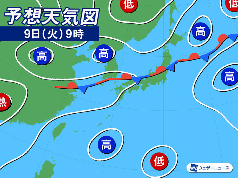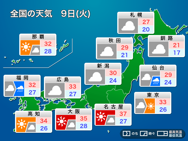 西日本や東日本の太平洋側では、日差しが届いてもにわか雨の可能性がある変わりやすい空となります。雨雲が発達して雷雨になるおそれもあります。天気の急変に注意してください。