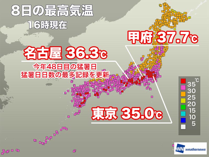 最も高い最高気温は甲府の37.7℃でした。名古屋は36.3℃を観測し、今年48日目の猛暑日となりました。これまで最も多かった昨年の47日を超えて、猛暑日日数の最多記録を更新しています。東京も35℃を観測、9月3日(水)以来5日ぶりの猛暑日です。東京は今年29日目の猛暑日で、こちらも過去最多記録を更新しました。(これまでの記録は2023年の22日)。