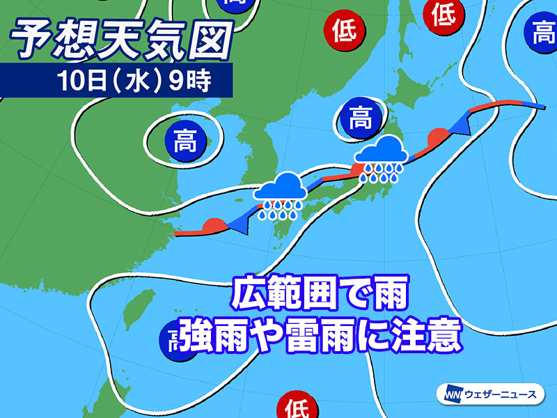 11日(木)も秋雨前線が本州付近に停滞します。東北から九州の広い範囲で雨が降る予想です。