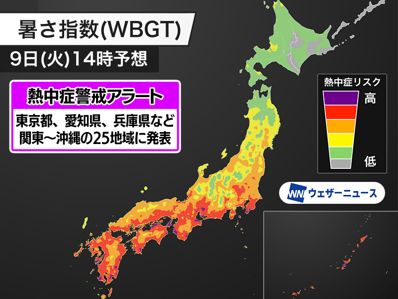 今日9月9日(火)の熱中症警戒アラート 東京都など関東〜沖縄の25地域に