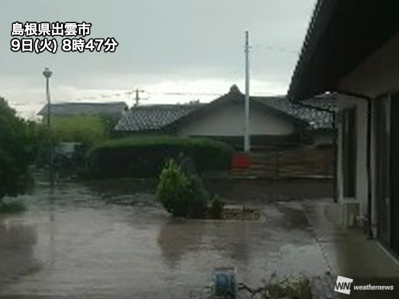 長崎県対馬市のアメダス鰐浦では6時44分までの1時間に46.0mmの激しい雨を、島根県出雲市鷺浦に設置された雨量計では9時20分までに58.0mmの非常に激しい雨を観測しました。島根県の出雲市、松江市には土砂災害警戒情報が発表されています。