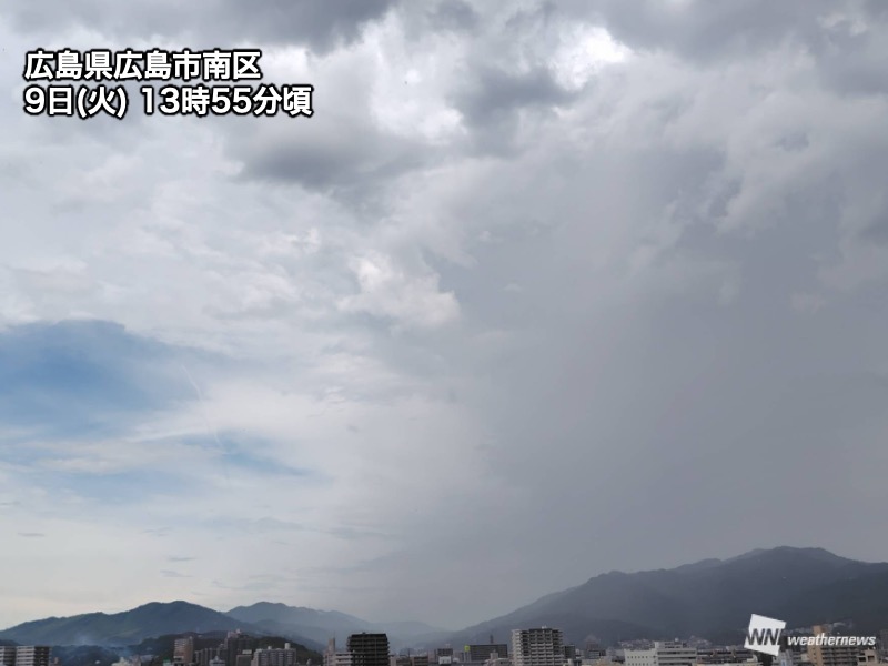 山沿いだけでなく都市部の直上でも風が集まることで雨雲の発生している所があります。広島市では13時30分〜40分の10分間で14.5mm(1時間降り続くと80mm超)の猛烈な雨を観測しました。上空の風がやや強いため、活発な雨雲はすでに広島市からは離れています。このほか、大津市付近や名古屋市付近などで雨雲が発達している状況です。