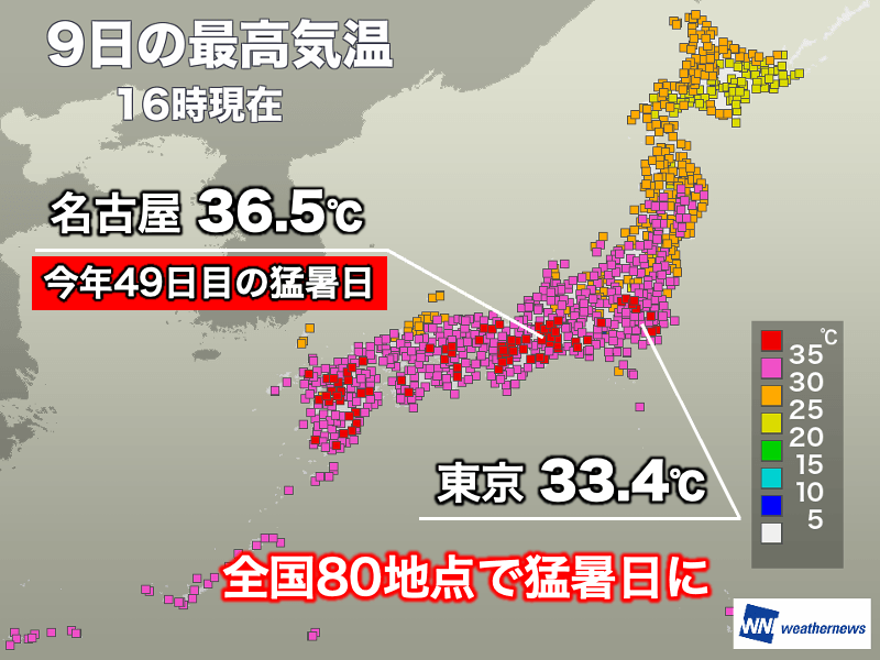 名古屋は昼前に35℃に到達し、今年49日目、年間の猛暑日日数の記録を更新しています。16時までの猛暑日地点数は全国で80地点と、昨日8日(月)より10地点多くなりました。