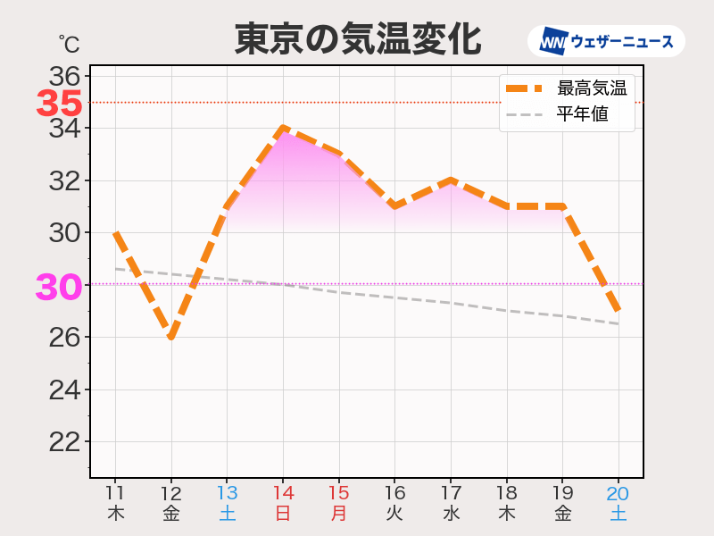 一方で、西日本や東日本ではまだ30℃を超える日が多く、昼間の蒸し暑さは続く予想です。油断せず、体調管理をしっかり行うようにしてください。