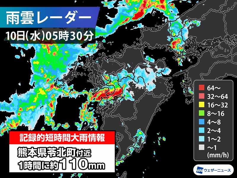 熊本県で1時間に約110mmの猛烈な雨 記録的短時間大雨情報