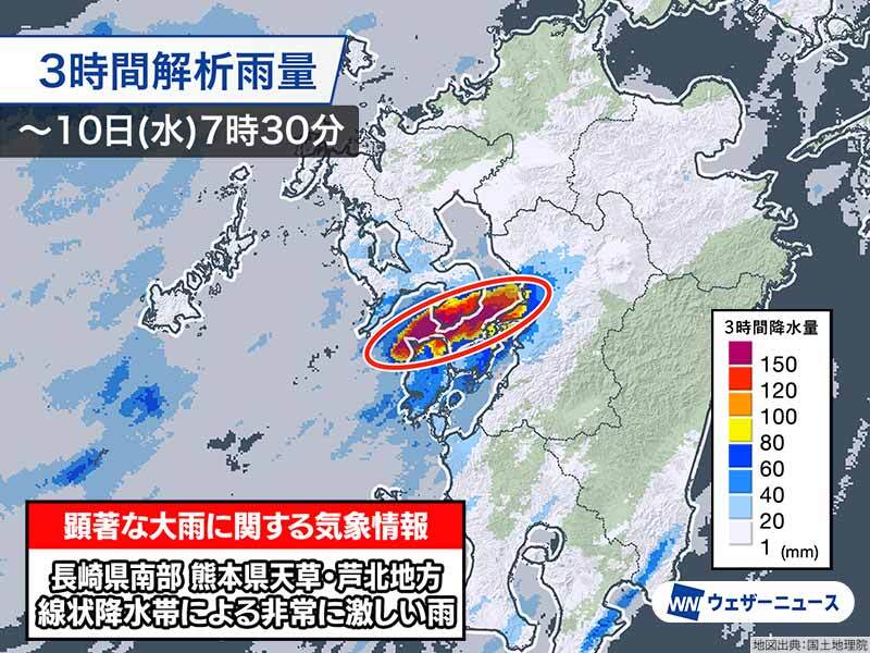 気象台は、長崎県南部、熊本県天草・芦北地方で線状降水帯による非常に激しい雨が同じ場所で降り続いているとして、「顕著な大雨に関する情報」を発表しています。雨のピークを過ぎた後も、土砂災害や低い土地の浸水、河川の増水・氾濫等に警戒してください。
