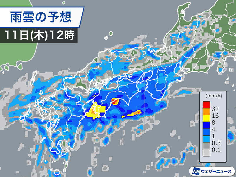 明日11日(木)にかけては、寒気を伴った気圧の谷が上空を通過する影響で前線の活動が活発になり、雨の範囲が広がる予想です。