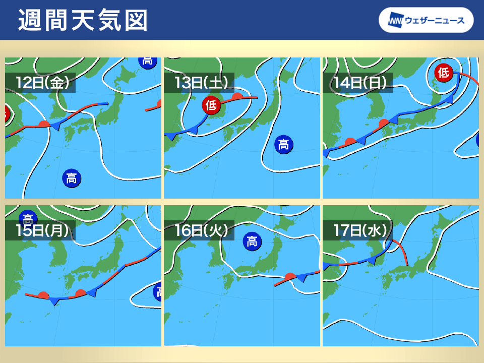 12日(金)は前線の活動が一旦弱まりますが、三連休の初日となる13日(土)頃からは、日本海を北東に進む低気圧が北日本に接近・通過するとみられます。
