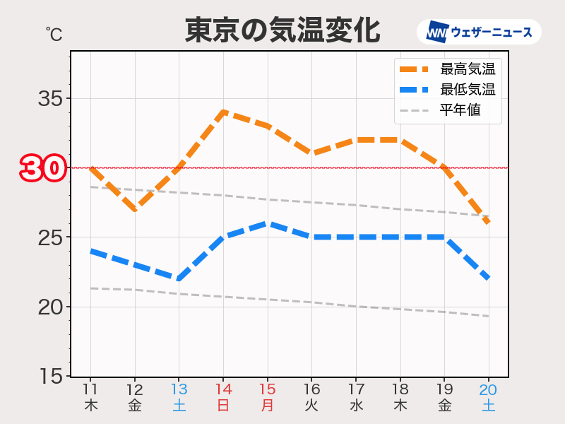 一方で、西日本や東日本では上空の暖かい空気の影響でまだ30℃を超える日が多く、昼間の蒸し暑さは続く予想です。油断せず、体調管理をしっかり行うようにしてください。