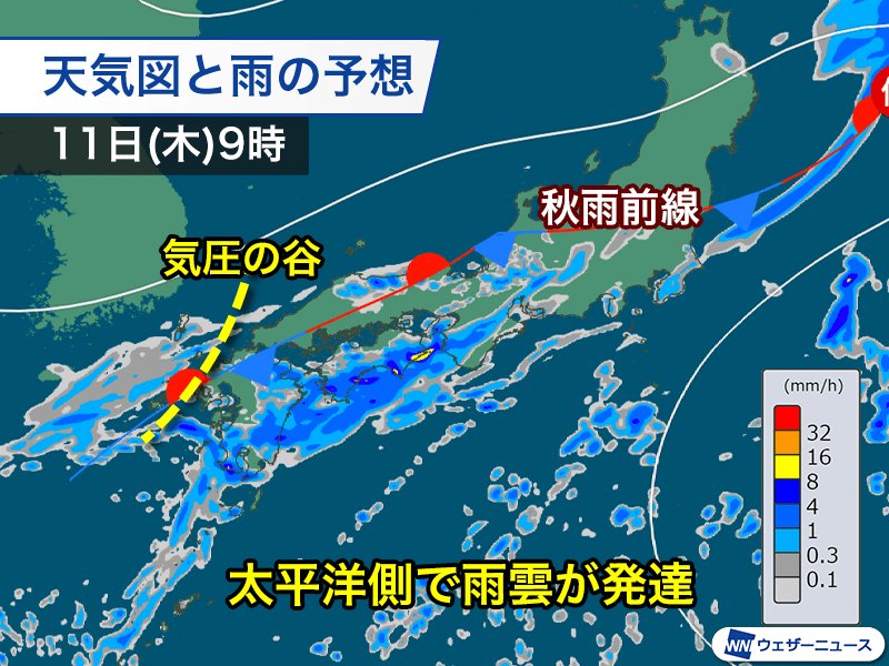 明日11日(木)は秋雨前線が今日に比べるとやや南下します。新たな気圧の谷が進んでくる影響で、西日本の太平洋側で雨雲が発達しやすく、雨の強まる所がある見込みです。
