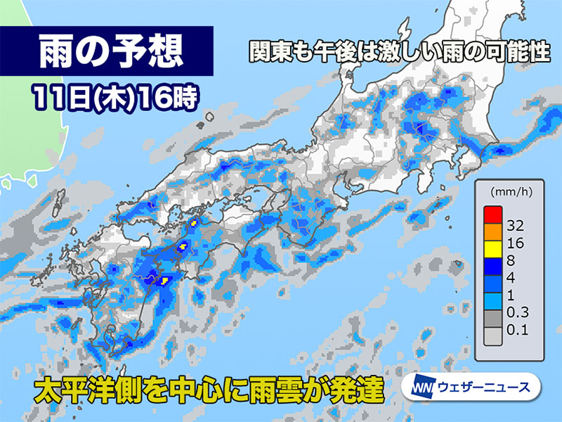 今日11日(木)は秋雨前線が昨日に比べるとやや南下します。新たな気圧の谷が進んでくる影響で、西日本の太平洋側で雨雲が発達しやすく、雨の強まる所がある見込みです。