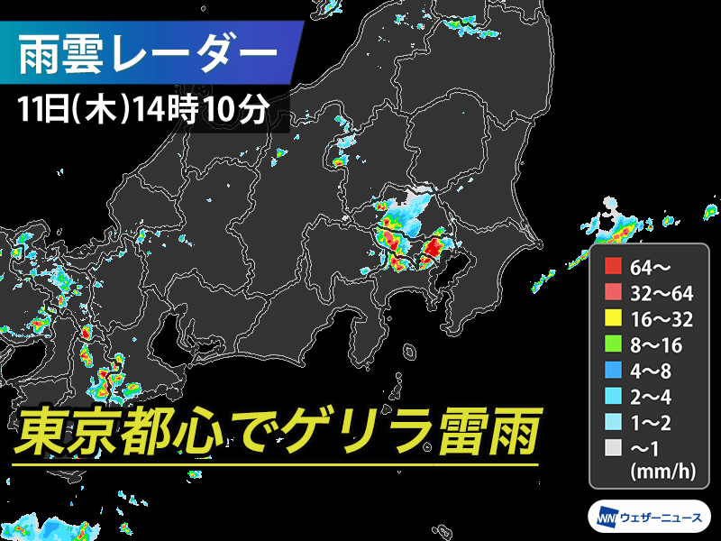 南風と北風が収束して13時前後から神奈川県西部で雨雲が急発生しました。発生した雨雲は上空の南西風に流されて、横浜市付近で発生した別の雨雲と合体。急速に発達しながら北東に移動して東京23区内にも流れ込み、ゲリラ雷雨となっています。