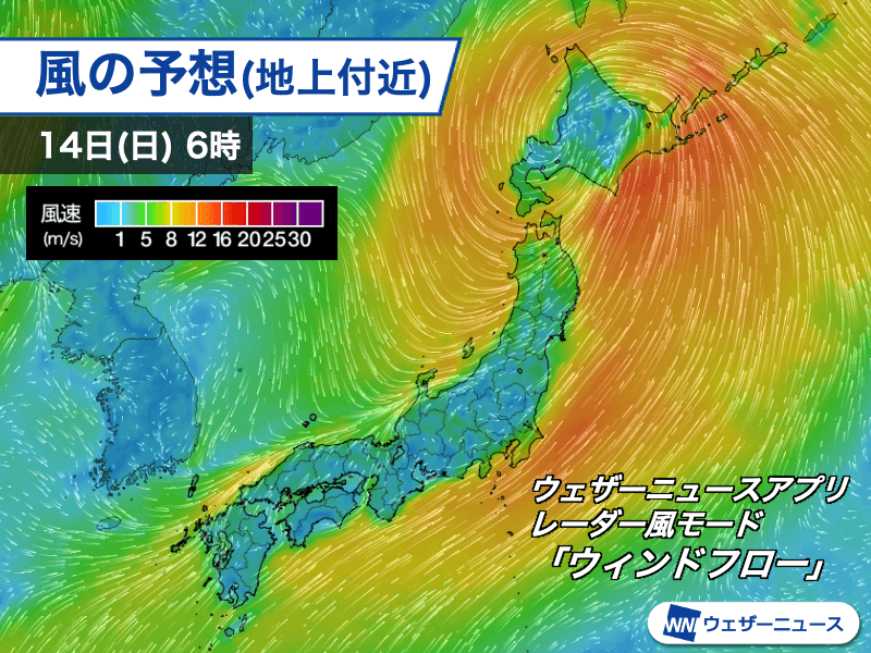 低気圧が発達しながら接近するため、沿岸部を中心に南寄りの風も強まります。特に夜は北日本で暴風レベルの突風が吹くおそれがあり、外出は危険です。交通機関にも影響が出る可能性があります。飛ばされやすいものは早めに屋内へ仕舞い、出かける場合は早めに帰宅してなるべく窓からは離れた所で就寝するようにしてください。