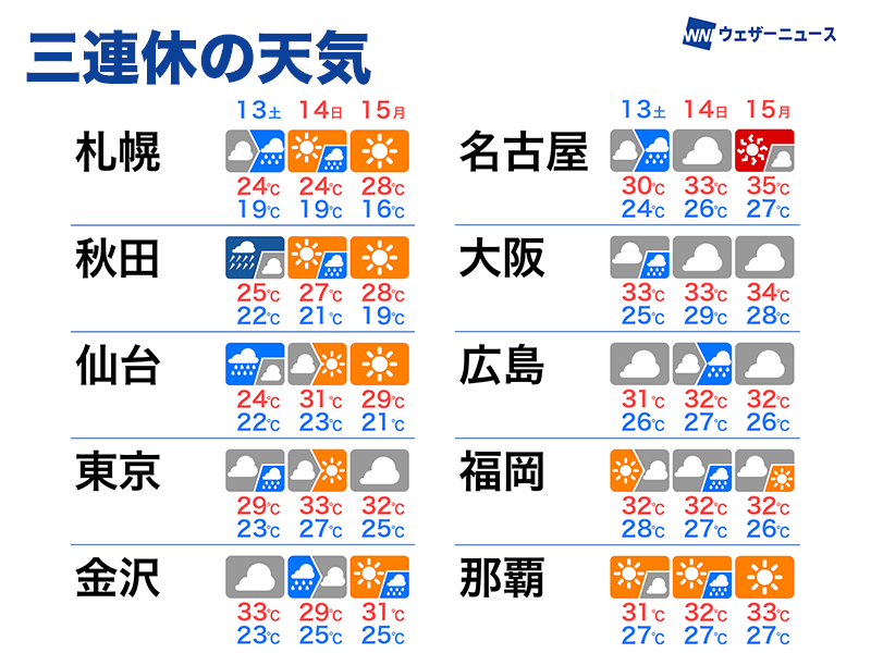 三連休最終日となる明後日15日(月)の敬老の日は、北日本は高気圧に覆われて日差しが届きます。東日本や西日本は前線の影響で雲が広がりやすく、にわか雨や雷雨の可能性があるため、折りたたみ傘があると安心です。