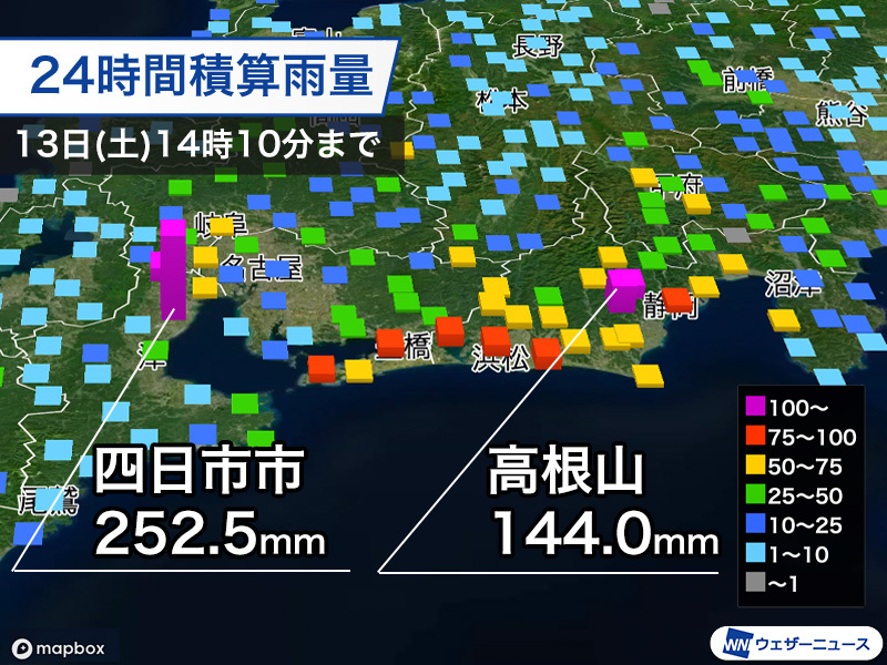 東海付近では昨日12日(金)から強弱を繰り返して雨が降っています。昨夜は三重県四日市市で1時間に123.5mmの猛烈な雨が降り、今朝7時20分までの24時間降水量は261.0mmに達しました。14時現在は湿った空気の流れ込みやすいエリアが少し東に移動し、静岡県周辺で雨量が多くなってきています。14時10分までの24時間降水量は藤枝市高根山で144.0mm、静岡市鍵穴で102.0mmと、100mmを超えてきました。