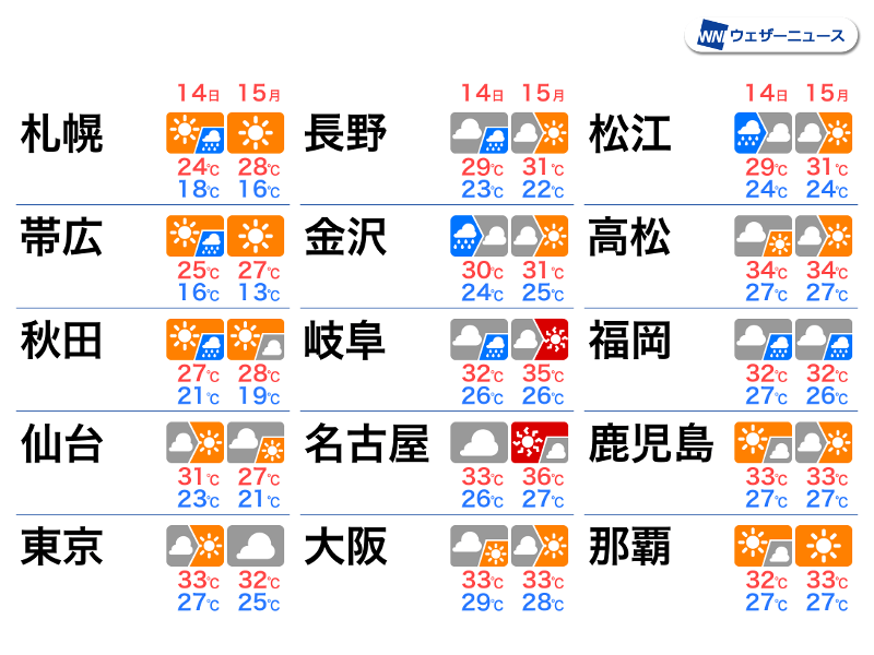 15日(月・祝)は特に東海西部で気温が高くなる予想で、最高気温は名古屋市や岐阜市で35℃に達する可能性があります。名古屋市で猛暑日となれば、今年51日目です。
