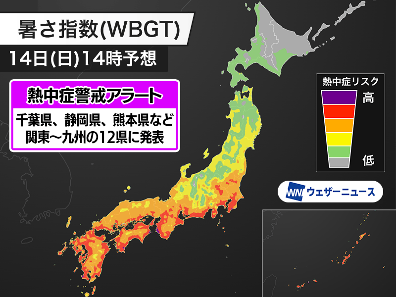 今日9月14日(日)の熱中症警戒アラート 関東〜九州の12県に発表