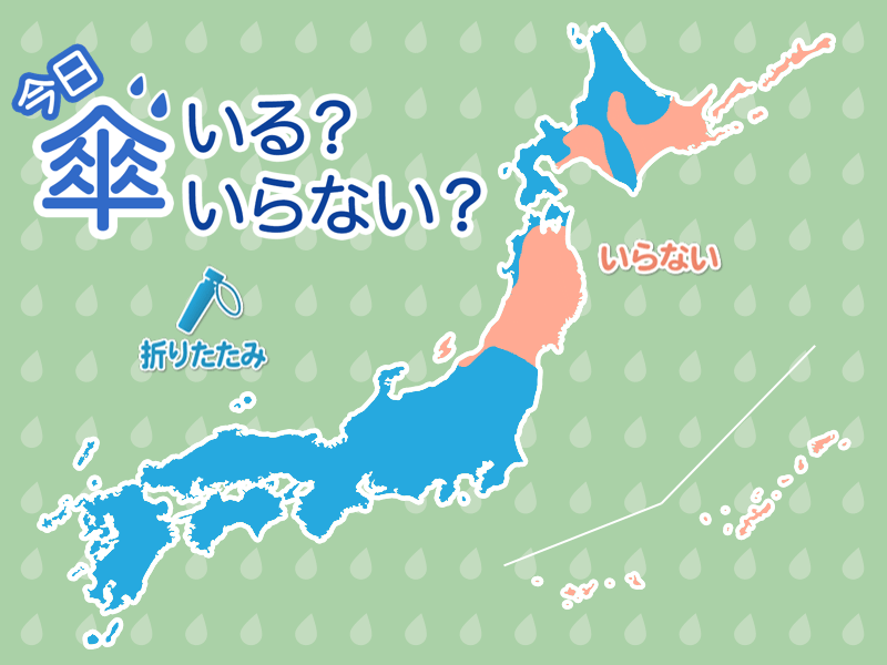 北海道や東北北部は晴れていますが、午後は雨雲が接近してくるため、折りたたみ傘を持っておいたほうが良さそうな所があります。