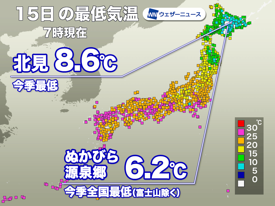 今朝7時までに最も気温の下がったのは北海道上士幌町のアメダスぬかびら源泉郷で、9月下旬並の6.2℃を観測しています。これは今年8月1日以降での全国最低気温です(富士山を除く)。