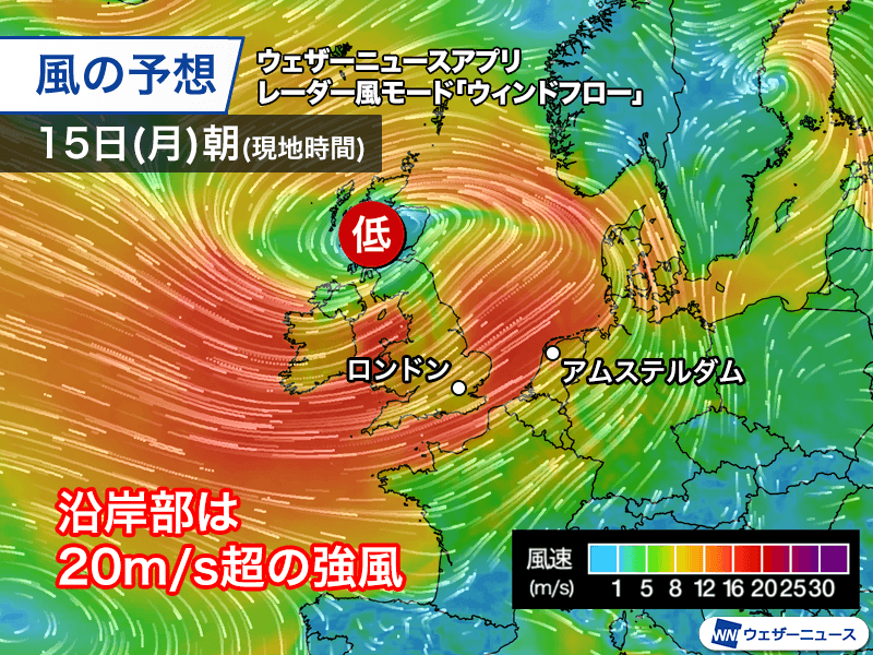 現地時間の15日(月)午後にかけて低気圧は北海方面に進み見通しで、風の強いエリアが拡大していく見通しです。イギリスやアイルランドに加え、フランスからオランダ、ドイツの北海沿岸でも風が吹き荒れるとみられます。