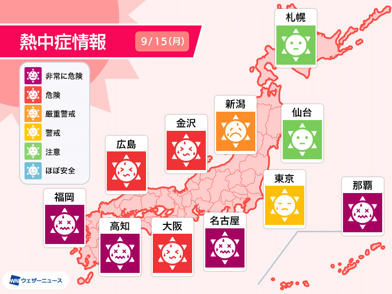 午前中から厳しい残暑となっている東海と西日本は熱中症のリスクが高く、名古屋市や福岡市は「非常に危険」ランク、そのほかの各地も「危険」ランク以上です。