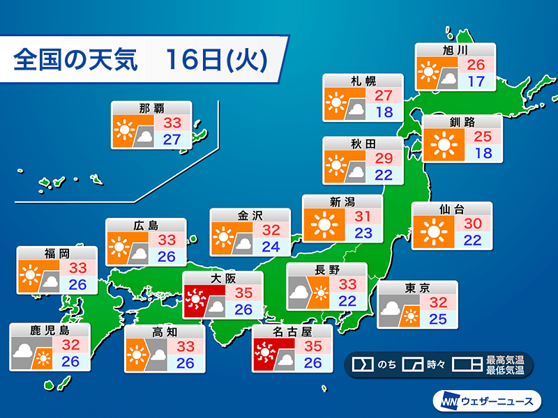 名古屋市と大阪市の最高気温はともに35℃の猛暑日となる見通しです。東京都心は今日よりも日差しが増えて、32℃まで上がる予想となっています。熱中症対策がまだ必要です。