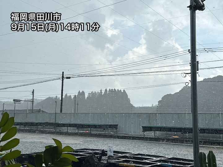 午後になり福岡県や広島県などで雨雲が発達してきました。雨雲の一つ一つはそれほど大きくないものの活発で、通過した所では土砂降りの雨です。14時10分までの1時間に福岡県太宰府市で25.0mm、広島県広島市・三入で28.0mmの強い雨を観測。雨に加えて雷も伴っています。