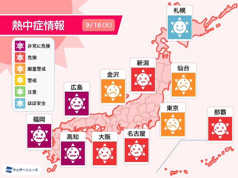 明日9月16日(火)の天気予報 三連休明けも暑さに注意 天気急変の可能性も