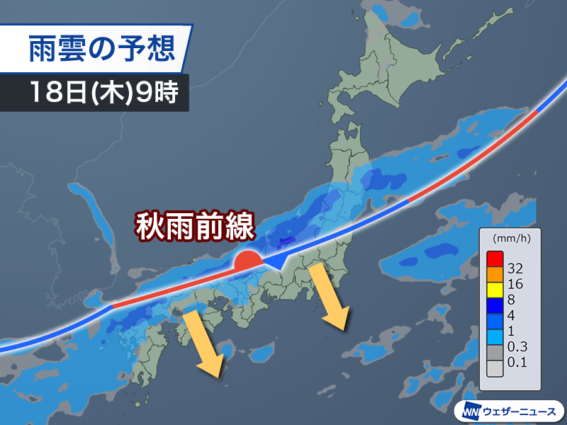 秋雨前線が活発になり本州付近を南下 雨の強まる所も
