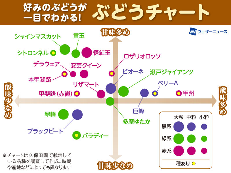 ぶどうチャート シャインマスカットや巨峰など、甘さや粒のサイズなど比較