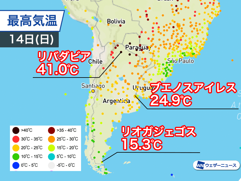 南米大陸の沖の大西洋に勢力の強い高気圧があり、アルゼンチンは北部を中心に暖かな空気が流れ込みやすくなっています。パラグアイとの国境に近いサルタ州・リバダビアの観測点では14日(日)に41.0℃を観測しました。