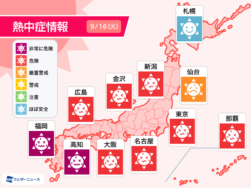 午後も晴天の続く所が多く、広い範囲で熱中症リスクが高くなります。福岡市や高知市は「非常に危険」ランク、そのほかの西日本、東日本は「危険」ランクです。