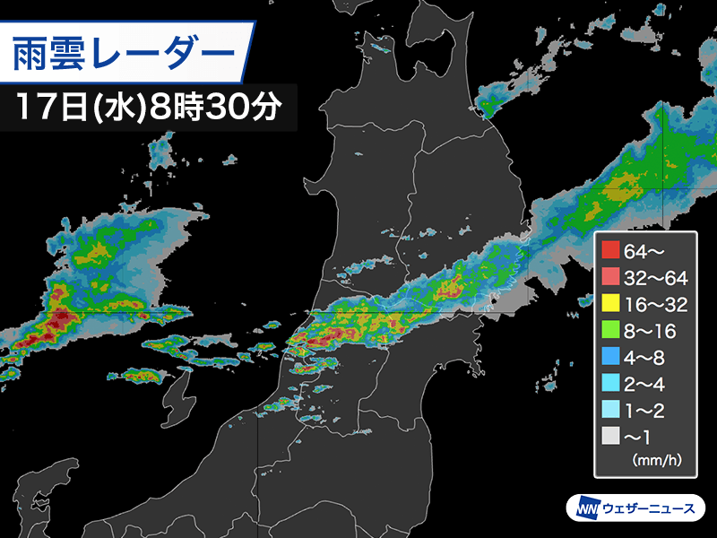 前線は南下して秋田県内では一度強雨のピークを越えつつありますが、日本海上には発達した雨雲が控えていて、この後も断続的に雨が降るとみています。