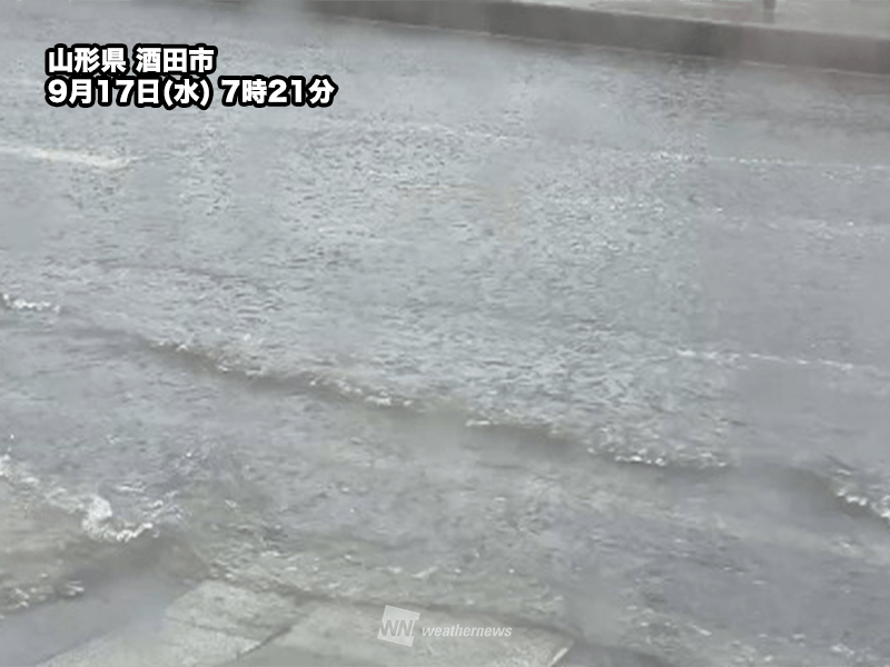 秋田県能代のアメダスでは4時51分までの1時間に観測史上最大の90.5mmの猛烈な雨を観測しました。今朝は秋田県内の他の観測地点や山形県庄内エリアでも時間30~40mmの激しい雨を観測。9時現在、秋田県内には大雨警報が発表されています。