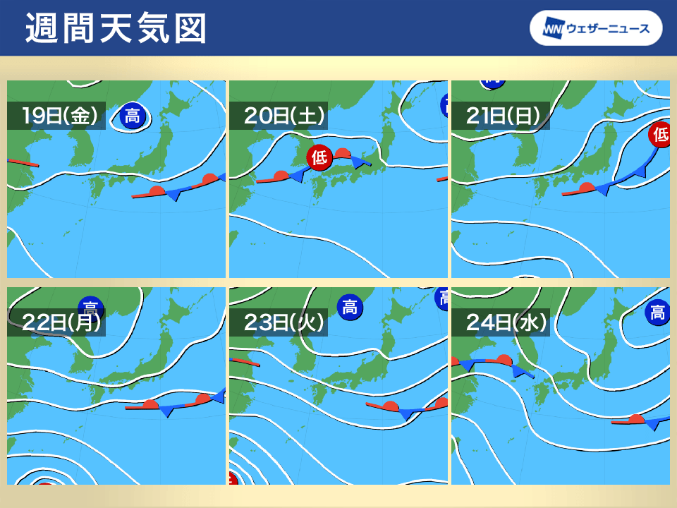 19日(金)以降は、秋雨前線が本州南岸付近に停滞するため、西日本や東日本ではスッキリしない天気が続きます。