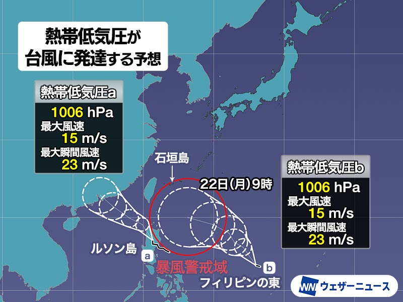 フィリピンの東にある熱帯低気圧bは、発達しながら北西に進んで22日(月)には沖縄の南に達する予想です。そのまま沖縄に直撃する可能性は高くありませんが、暴風域を伴う勢力に発達する予想で、先島諸島を中心に波や風、雨の影響がでる可能性があります。今後の情報にご注意ください。